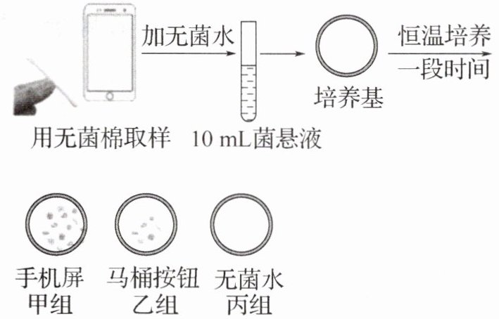 30. 针对“手机屏幕的细菌比马桶按钮的多”的传言,某兴趣小组分别用无菌棉棒从手机屏幕和马桶按钮的相同面积上取样后分别制成两份10mL菌悬液,各取0.1mL菌悬液均匀涂抹在相同的培养基上,放入同一恒温培养箱中,一段时间后进行观察和统计,过程及结果如图所示: