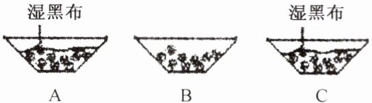 【实验过程】 ①将600粒大小相差不大的黄豆放在水里泡一夜,第二天滤去水分,将黄豆随机平均分成三份装在标有A、B、C的相同的漏篮(四周布满小孔,水可以渗出)中。