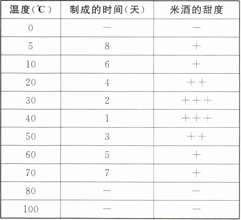 6. 你知道《水浒》中“武松打虎”的故事吧,武松在景阳岗前喝下的“十八大碗酒”实际上是米酒,它是由糯米蒸熟后经过酵母菌发酵制成的,在制作过程中温度不同,其制成米酒的质量以及时间也就不同。下表是米酒制成的质量与时间、温度的关系,根据表格回答下列问题:(“-”表示无法制成,“+”表示米酒的甜度,“+”越多表示酒甜度越高)