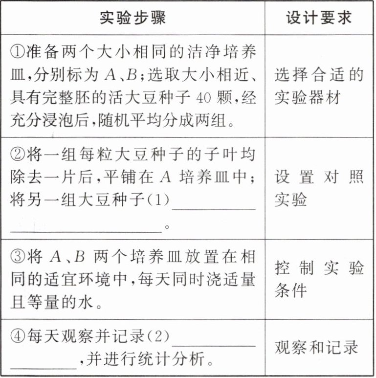 (3) 另取两组与 B 组相同的大豆种子,经充分浸泡后,除去一片子叶,再将剩余的一片子叶分别除去 $\frac{1}{3}$、$\frac{2}{3}$ 后,重复上述实验(其他合理的表述也可)