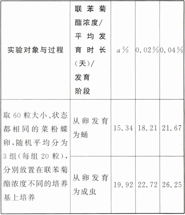 8. 某兴趣小组为了研究“联苯菊酯对菜粉蝶各发育阶段发育速度的影响”,将菜粉蝶卵分别放置在联苯菊酯浓度分别为a%、0.02%、0.04%的三个培养基上进行培养,实验记录的数据如表所示: