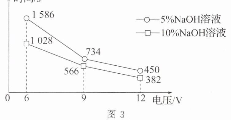 (5) 电解纯水速率较慢,为探究不同电压和不同浓度氢氧化钠溶液对电解水速率的影响,小组同学进行多次实验,测得产生20mL氢气所需时间如图3所示: