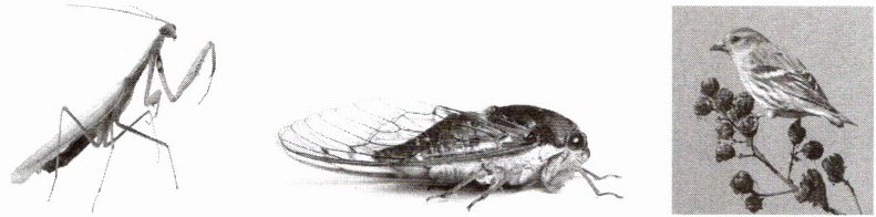 16. 下列三幅图分别是螳螂、蝉、黄雀的外部形态示意图。