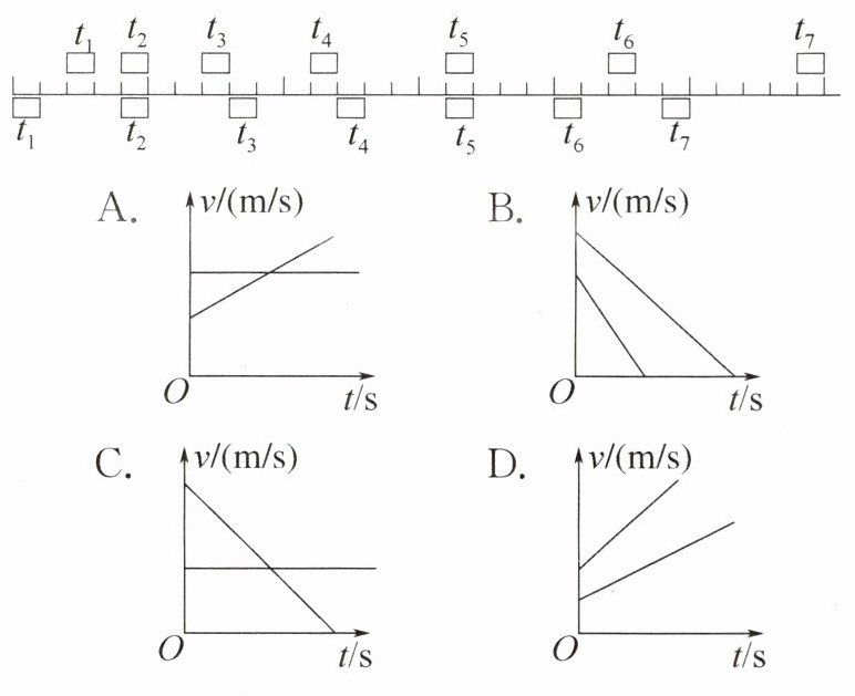 12. 如图所示,两木块自左向右运动,现用高速摄影机在同一底片上多次曝光,记录下木块每次曝光时的位置。已知连续两次曝光的时间间隔是相等的。下列 v-t 图像中,能正确描述两木块运动情况的是()