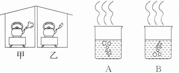 20. 在学习了有关物态变化的知识以后,小明回家做了如下实验:甲、乙两个房间里相同的电炉上,相同的两壶水都已烧开,水烧开后壶口冒出“白气”。请回答: