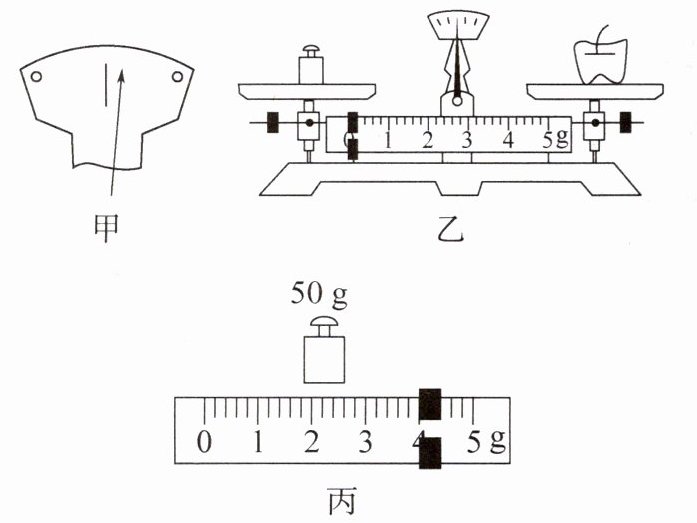 19. 小海在用天平测物体的质量,他拿出托盘天平放在水平桌面上,并将游码移到零刻度线,发现指针偏转如图甲。