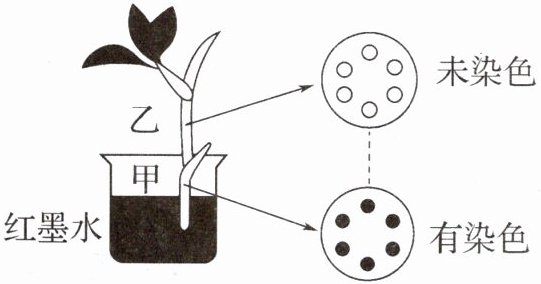 21. 为了探究茎中运输水分和无机盐的部位,小明取带有3片叶子的海桐枝条进行如图实验,一段时间后,自下而上在枝条不同部位进行横切,其中距枝条底部5cm部位标记为甲,直至横切面上刚好观察不到染色现象的部位标记为乙。小明另取大小及长势相同、带有6片叶子的海桐枝条,在相同环境下重复上述实验。推测该枝条甲、乙两处横切面的染色情况 ()