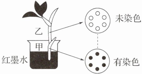 24. 为了探究茎中运输水分和无机盐的部位,小明取带有3片叶子的海桐枝条进行如图实验,一段时间后,自下而上在枝条不同部位进行横切,其中距枝条底部5厘米部位标记为甲,直至横切面上刚好观察不到染色现象的部位标记为乙。小明将海桐枝条横截面切开,发现红色染液分布于茎的 ()