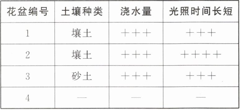 (3) 为了通过与1号盆的比较来确定浇水量多少对植物生长的影响,请你参照上表的方法对4号盆的土壤种类、浇水量、光照时何作出设计:____。