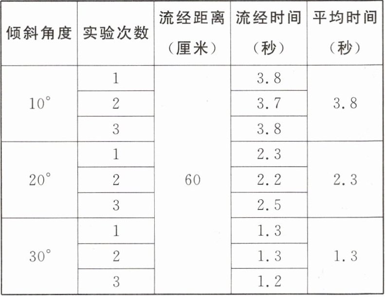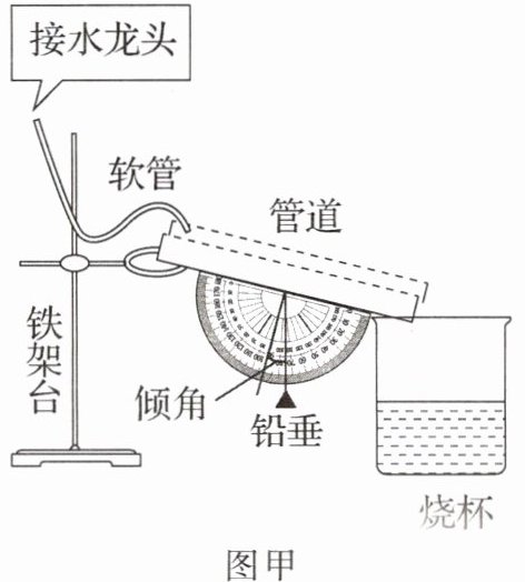 34. 为了研究水流动快慢与坡度的关系,某科学兴趣小组设计了如下实验。为了解决测量时水的流动位置难以确定的困难,他们往水中加入泡沫粒,以泡沫粒的运动显示水的流动过程。以下是他们测量和记录的相关数据:(装置如图甲所示)