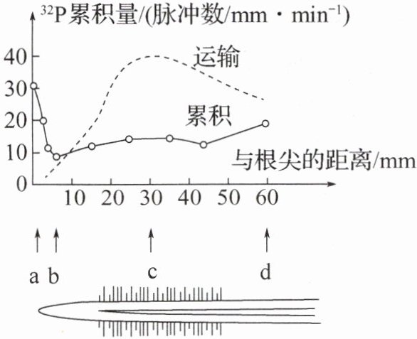 D. d点$^{32}P$的累积量最大,是因为该处没有导管,不能将$^{32}P$向上运输