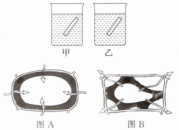3. 小明在探究植物细胞的吸水和失水时,设计使用清水、20%的食盐水、两块从同一萝卜上切下的大小、质地相同的萝卜条等材料,并按照如图所示的装置(甲、乙)进行实验,有关分析正确的是 ()