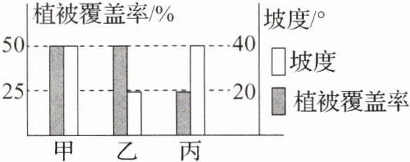 (3) 改进实验后,小柯发现植被覆盖率越低,水土流失越严重。查阅资料后知,在一定范围内,坡度越大,水流对土壤的侵蚀能力越强。请结合以上信息判断,下图中____地区土壤侵蚀最严重。