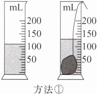 ① 测量小石块:在量筒里注入适量的水,记下水的体积 $ V_1 $,然后轻轻放入石块,使量筒里的水完全浸没石块,记下此时水及石块的体积 $ V_2 $,计算石块的体积。