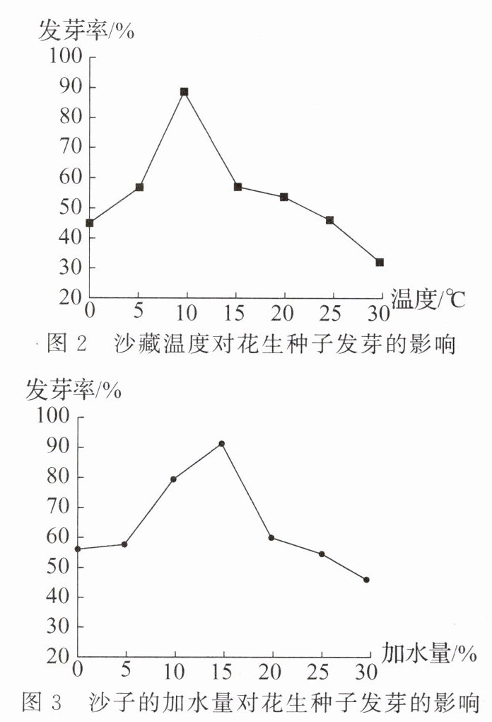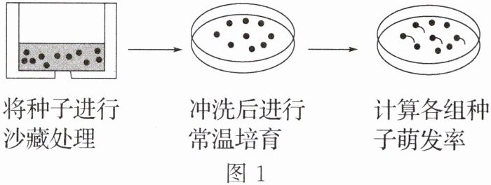其种子具有休眠性,某兴趣小组拟用沙藏法打破花生种子的休眠,并通过实验找到最适宜的沙藏条件。其实验过程如图1所示,沙藏处理方式及实验结果如图2、图3所示,回答问题:
