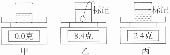 步骤一:使用一台电子秤,取一个杯子,注入适量的水,把杯子放在电子秤上,归零,如图甲;