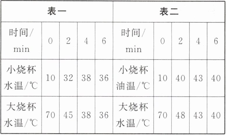 24. 为了验证水与食用油吸热能力大小,小科和小芳设计了如图实验装置。他们在大烧杯中装入500mL热水,用温度计监测其温度,在小烧杯中装入90mL冷水,用温度计测得其初温为10℃。当大烧杯内热水温度降低到70℃时,迅速将小烧杯放入大烧杯的热水中,并开始计时。每隔2min测量一次小烧杯和大烧杯中的水温,并记录数据在表中,6min后结束实验。再将小烧杯中的冷水换成100mL食用油重复以上实验,并记录数据在表二中。(已知实验使用的食用油密度为$0.9g/cm^3)$