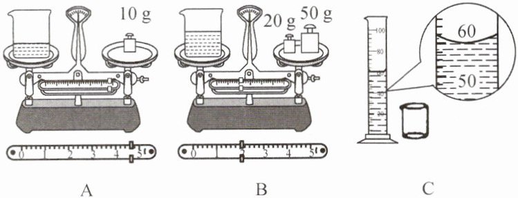 (2) 小明在古镇买了米酒。回家后,按图所示A→B→C的顺序进行了实验,测出了米酒的密度。由图所示数据求得米酒的密度为______千克/米^