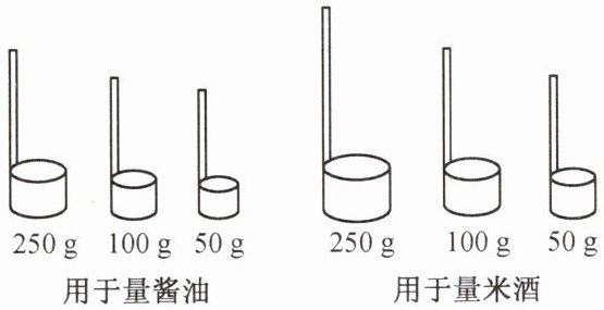 (1) 米酒的密度比酱油的密度小,相同质量的米酒与酱油,体积较大的是米酒。因此量取相同质量的米酒时所用的器具比量取酱油的要大一些。