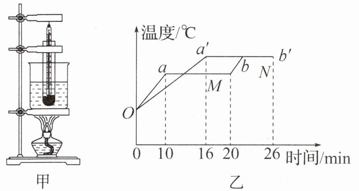 8. 如图甲所示,架设两套完全相同的加热装置,两套装置的试管中分别装有少量等体积的M、N两种固态物质。它们用相同热源加热时温度随时间变化的图像如图乙所示。在26min内,M物质从固体变为了液体,N物质始终是固体。根据图像分析,下列说法正确的是()