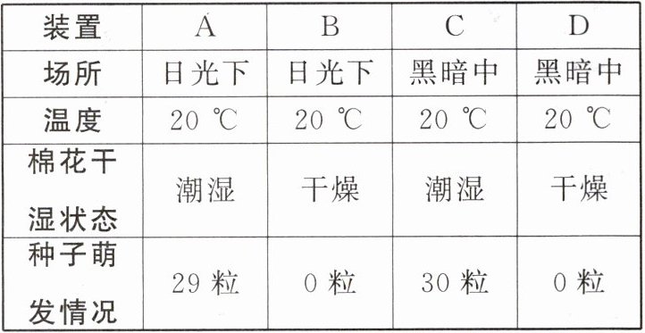在A、B、C、D四个培养皿内分别放入等量的棉花,在棉花上放30粒饱满、结构完整的小麦种子,然后将它们放在不同的条件下进行培养,数日后记录种子的萌发情况如下表: