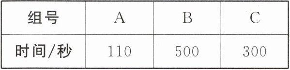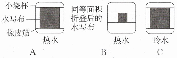 5. 水写布是一种遇水马上显黑色墨迹、水干后褪色可以重新书写的画布。某同学用水写布探究影响蒸发快慢的因素,实验方案如下:取三块大小合适、面积相等的方形水写布浸湿,将其中一块进行折叠。在水写布四角穿孔,用橡皮筋绑定在烧杯的外壁上,如图所示,A、B组烧杯中加入等量热水,C组加等量冷水,记录水写布上墨迹褪尽所需要的时间,如下表所示。