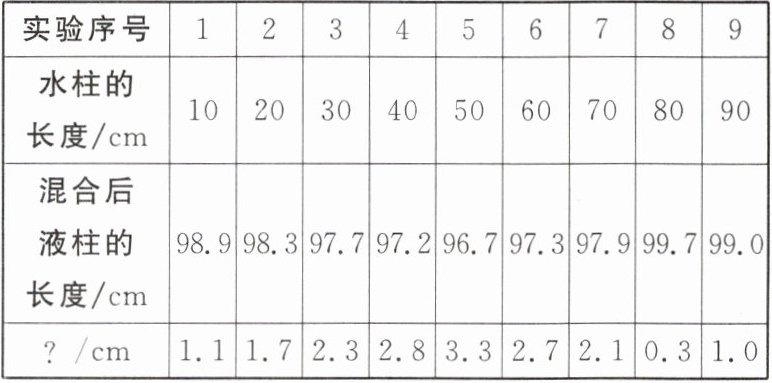 6. 在探究分子之间是否存在间隙时,小嘉发现水和酒精混合前的总体积一定,两者的比例不同,混合后减小的体积也不同。于是,他开展了进一步探究: