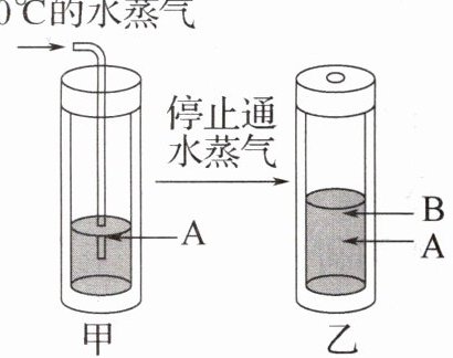 4. 酷爱科学的小亮为了探究液化过程放热还是吸热,设计并完成了下面实验:①将一定质量温度为$t_1$的冷水装入一个双层玻璃真空保温杯中,液面如图甲所示位置,标记为A。②向杯中插入导管,将100℃的水蒸气通入冷水中,发现杯中水面明显上升(假设水蒸气全部被吸收)。③一段时间后,停止通入水蒸气,移出导管后,杯中液面位置如图乙所示,标记为B,再测出此时杯中水温为$t_2,$比较发现$t_2$高于$t_1。$于是小亮得出了液化放热的结论。