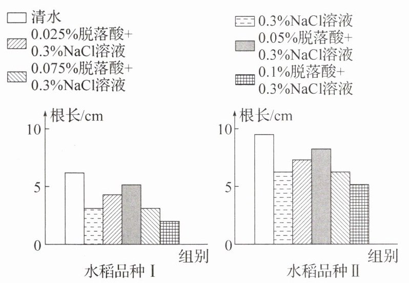 5. 水稻是我国重要的粮食作物,盐胁迫(植物在生长过程中因土壤中盐分过高而受到的不利影响)对水稻生长的危害已成为全球水稻生产的核心问题。脱落酸对植物的生长也会产生影响,已知水稻根长与产量呈正相关。研究人员选取了两个水稻品种,用0.3%的NaCl溶液模拟盐环境,探究不同浓度的脱落酸浸种后对水稻萌芽期根长的影响,结果如下图。