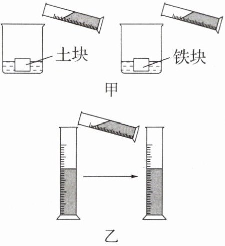 小兰:另取一块相同规格的铁块,将土块和铁块分别放入两只相同的烧杯中,用量筒量取一定体积的水,先沿烧杯壁缓慢地向烧杯内注水,如图甲所示。快要浸没土块或铁块时,?,直到水把土块和铁块刚好浸没。记录加入水的体积分别为$V_1、$$V_2。$