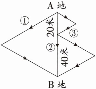 (2) 走②号路最近,①号路和③号路一样长。因为两点之间线段最短,所以②号路最近;①号路长度为$20 + 20+40 + 40 = 120$米,③号路长度为$(20 + 40)\times2 = 120$米,所以①③一样长。