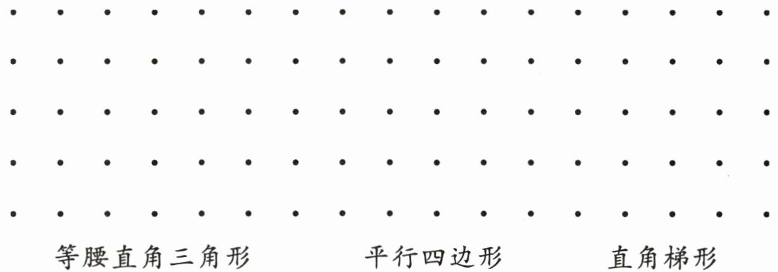 - 直角梯形:先画一个直角(如横向$3$个点子间隔,纵向$2$个点子间隔的直角),然后在直角的一条边上(假设是横向边),延长$2$个点子间隔,画一条与另一条纵向边平行(纵向间隔相同)的线段(长度可以不同,如$1$个点子间隔),最后连接各点形成直角梯形。