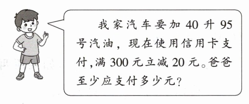 我家汽车要加40升95号汽油,现在使用信用卡支付,满300元立减20元。爸爸至少应支付多少元?