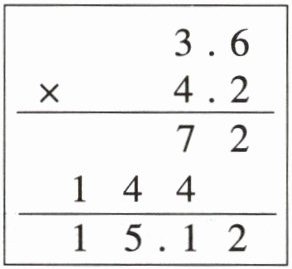 (3)大江一家四口,平均每月节约用水 4.2 吨,每吨水的价格是 3.6 元,他家每月少交水费多少元?右面是大江列的竖式,竖式中的“144”实际表示的是()元。