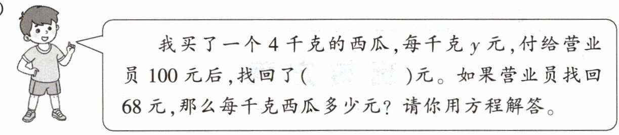 我买了一个4千克的西瓜,每千克$y$元,付给营业员100元后,找回了()元。如果营业员找回68元,那么每千克西瓜多少元?请你用方程解答。