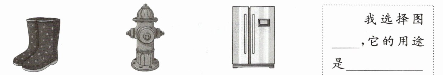 我选择图1(雨靴),它的用途是在雨天穿着,防止脚被雨水打湿。(或选择图2(消防栓),它的用途是在火灾等紧急情况时提供水源用于灭火等消防工作。或选择图3(冰箱),它的用途是冷藏和冷冻食物,延长食物保存时间、保持食物新鲜度等。)