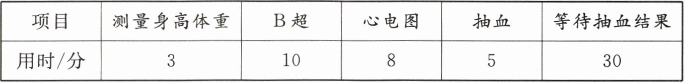 (2)大江陪奶奶去医院体检,需要体检的项目和所需的时间如下表所示。要想用时最短,奶奶首先要做()检查。
