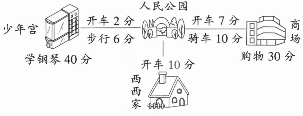 下午妈妈从家送西西去少年宫学钢琴,然后去商场购物,最后一起回家。下面是她们的行走路线和所用时间。她们办完这些事情至少需要多长时间?