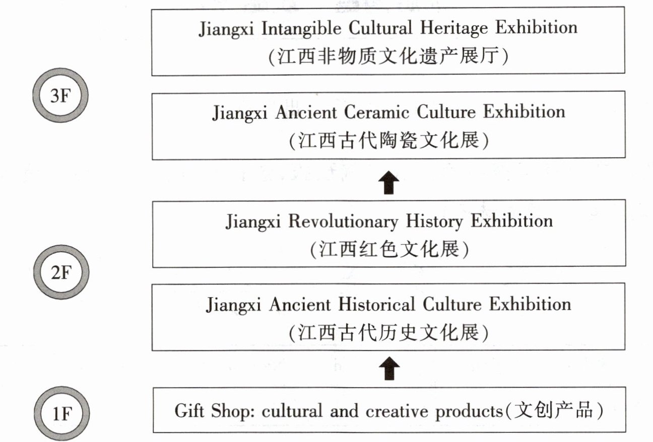 3 大江决定按照工作人员推荐的路线进行参观,感受博物馆独特的文化魅力。请根据下面的博物馆楼层导览图(部分)填空。