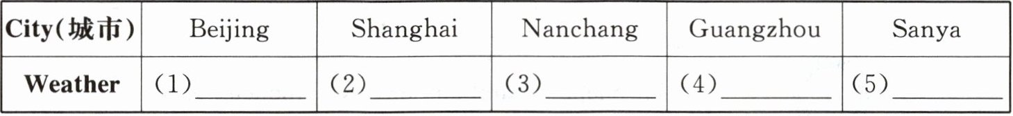 1现在是天气预报时间。听天气预报,选择正确的天气图片填入表格。(填序号,可重复选择)