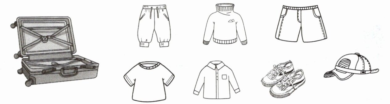 2 Peter和爸爸正在收拾行李。听对话,圈出需要打包的衣物,并给它们涂上相应的颜色。