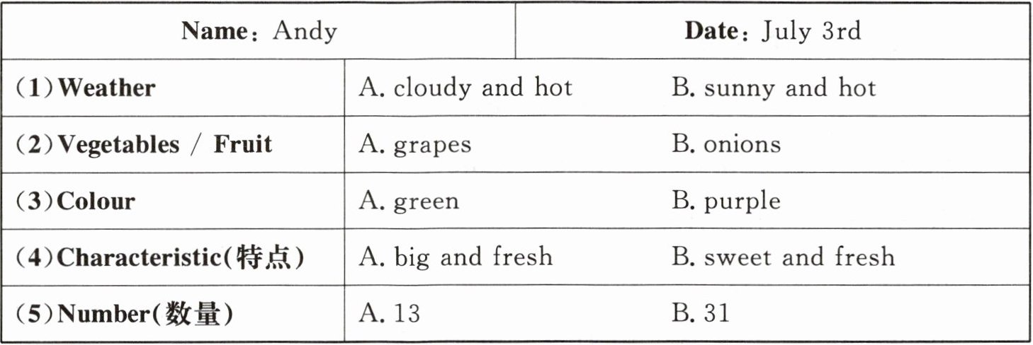 2. 七月盛夏,骄阳似火,农民 Andy 种下的种子成熟了。听短文,圈出正确的选项,完成 Andy 的采摘记录表。