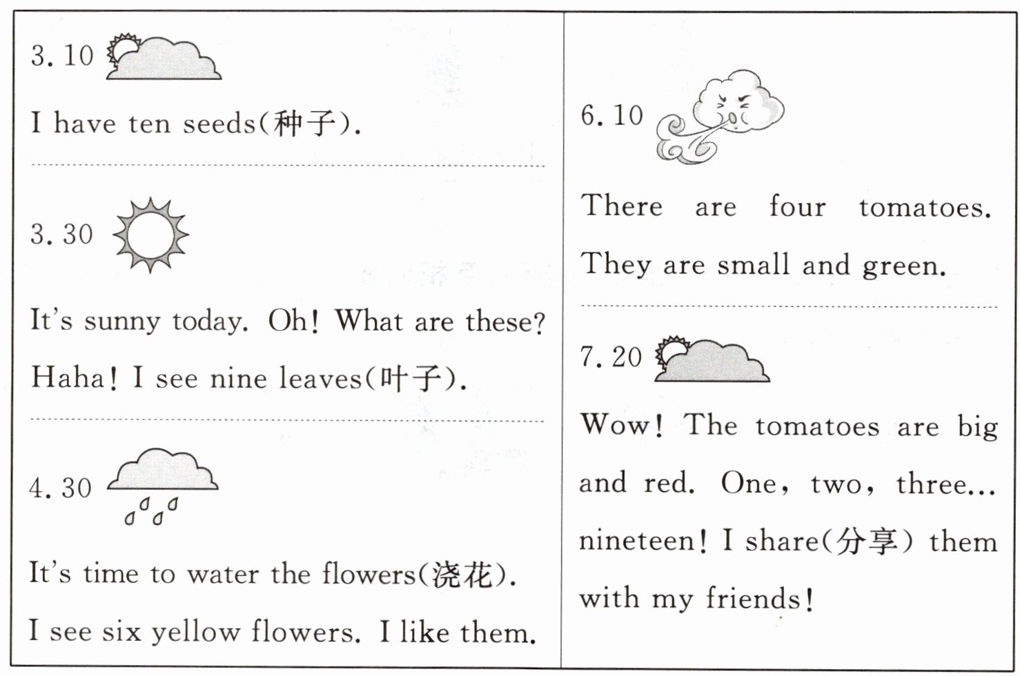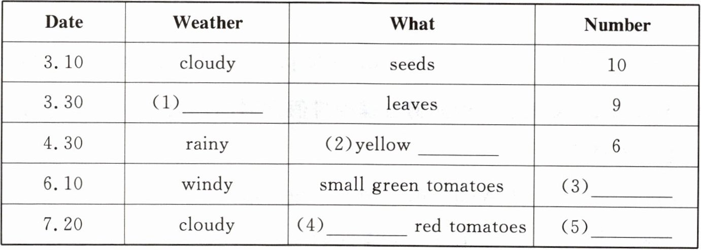 4. 在 Leo 的精心培育下,西红柿终于成熟了。请阅读 Leo 的观察日记,补全表格。