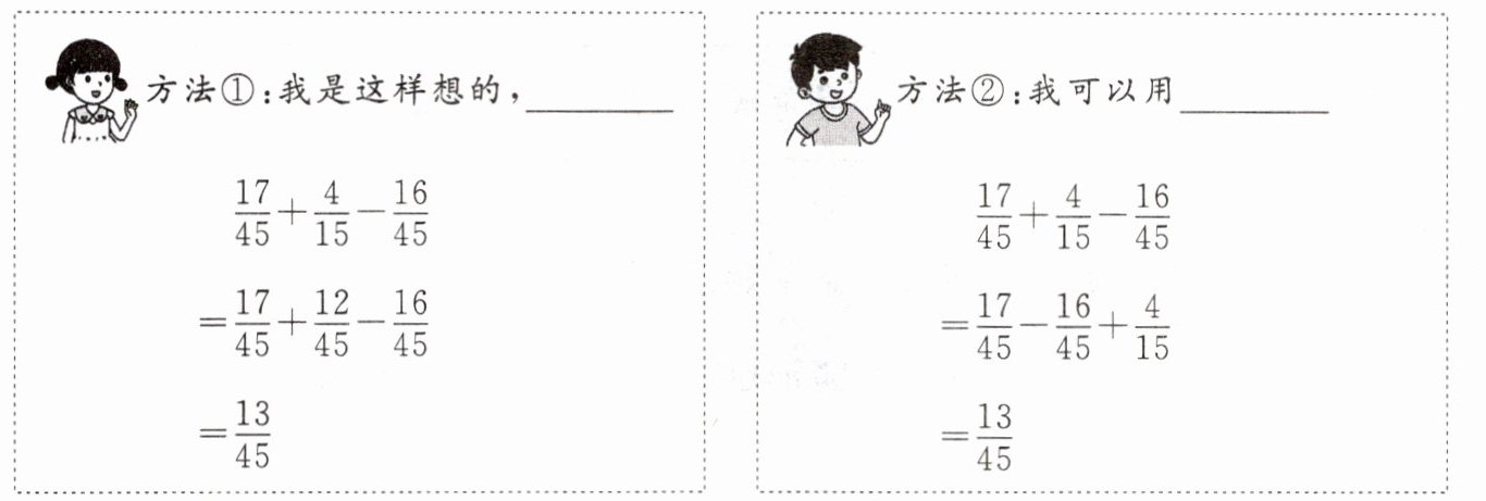 3 西西、大江和同学们来到陶艺体验区。$\frac{17}{45}$的同学进行彩绘,$\frac{4}{15}$的同学制坯,$\frac{16}{45}$的同学观看陶瓷制作流程,每项活动完成后再交换体验。进行彩绘和制坯的同学比观看陶瓷制作流程的同学多几分之几?(请你继续补充下面两种方法)