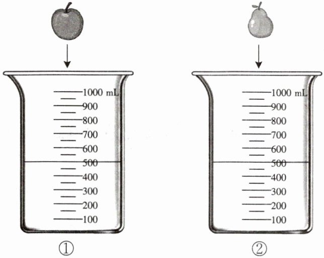(1)如果放入苹果的①号烧杯水面上升至900mL,放入梨的②号烧杯水面上升至850mL,那么苹果和梨体积的大小关系为()。