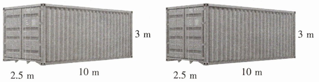 2 把下图中的两个长方体集装箱沿长和高所在的面拼在一起,拼组后这个大的长方体的表面积是多少?体积又是多少?