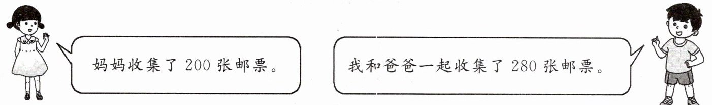 (2) $y + 4y = 280$,$5y = 280$,$y = 56$,$4y = 4\times56 = 224$,大江收集了$56$张邮票,爸爸收集了$224$张邮票。