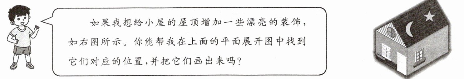 如果我想给小屋的屋顶增加一些漂亮的装饰,如右图所示。你能帮我在上面的平面展开图中找到它们对应的位置,并把它们画出来吗?