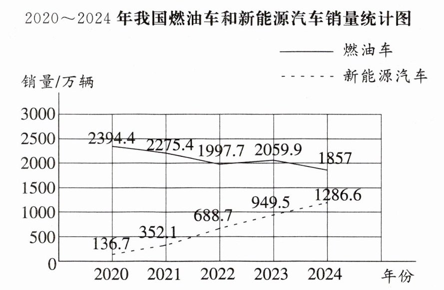 - (4)燃油车可能是$1600$万辆左右,新能源汽车可能是$1700$万辆左右。理由:燃油车销量整体呈下降趋势,新能源汽车销量整体呈上升趋势,根据前面年份的变化趋势进行合理推测(答案不唯一,合理即可)。