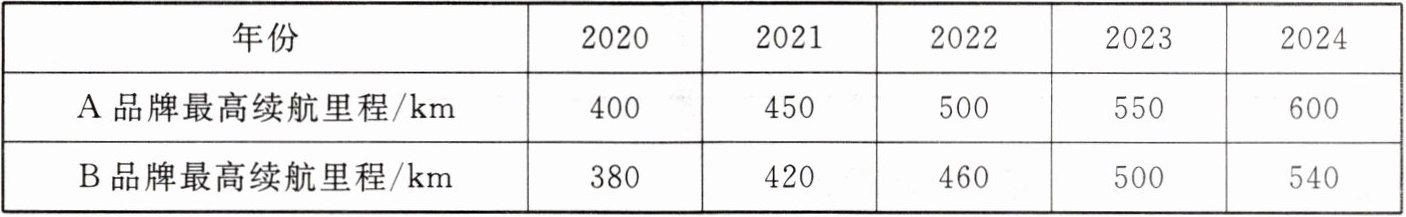 2020~2024年A品牌和B品牌新能源汽车最高续航里程数据统计图